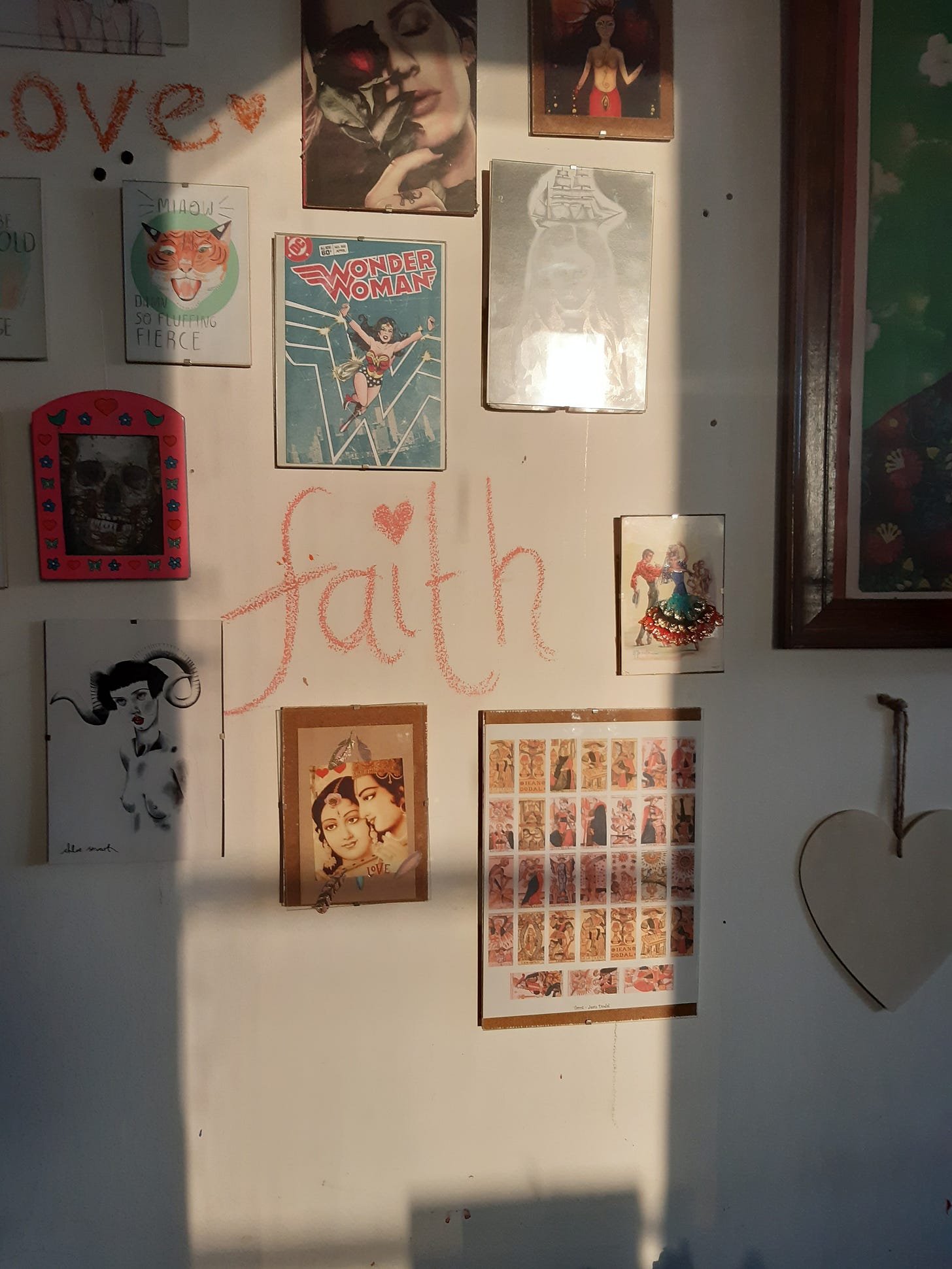 At about 6:50pm this evening the sunlight hit the main picture wall of my inner city flat making a frame around the word faith that once upon a time I had oil pastel scrawled on to it. This caught my attention for two reasons. One, my flat has been entombed within a scaffolding distopian nightmare for over 18 …